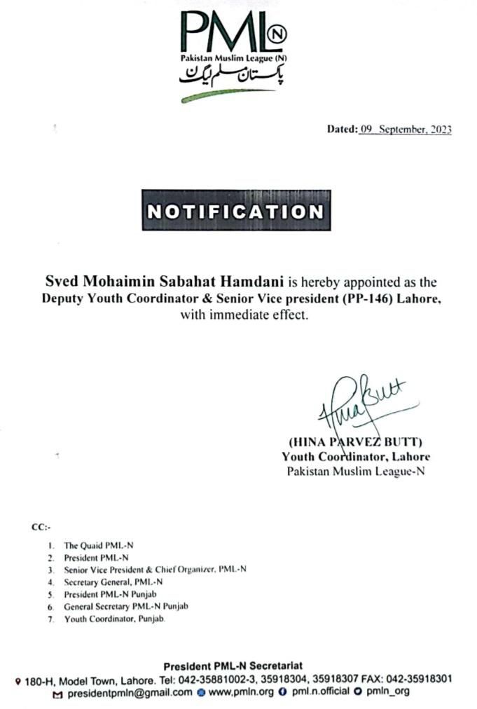 Pakistan Muslim League (N) • Notification dated 09 Sep 2023